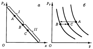 Рис. 16. Тот же процесс, что и на рис 15.Случай высокоэластичного спроса на товар Х Но эластичность не остается постоянной на всем протяжении кривой спроса. На рис. 17 показана линейная функция спроса на товар X. Участок I характеризуется высокой эластичностью, и при снижении цены товара Х на этом участке кривая спроса на товар Y сдвигается влево. Но в точке В эластичность становится единичной и при дальнейшем движении продолжает снижаться, а кривая спроса на товар Y начинает смещаться вправо (участок II).