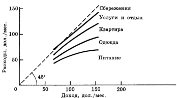 Рис. 7. Распределение потребительских расходов по статьям Заметим, что в теории потребления мы все время предполагаем, что потребитель весь свой доход тратит на приобретение различных товаров. В действительности же потребитель при некотором уровне дохода может делать сбережения. В этом случае доходы потребителя будут превышать расходы на величину сбережений (рис. 8). С другой стороны, при низком уровне дохода потребитель вынужден брать деньги в долг, чтобы свести концы с концами. Эта ситуация представлена на рис. 9.