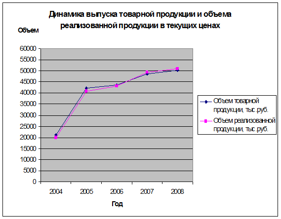 Определим средние темпы роста выпуска товарной продукции и объема реализованной продукции: Средний темп роста динамики выпуска товарной продукции в текущих ценах: Тр ср = 124,04% Средний темп роста динамики объема реализованной продукции в текущих ценах: Тр ср =126,685 Средний темп роста динамики выпуска товарной продукции в сопоставимых ценах: Тр ср = 111,48% Средний темп роста динамики объема реализованной продукции в сопоставимых ценах: Тр ср =113,86% Вывод: Объем товарной продукции и объем реализованной продукции с каждым годом увеличивались. В целом объем товарной продукции вырос на 29000 тыс.рублей, а объем реализованной продукции вырос на 31254 тыс. рублей. Динамика изменения темпов роста выпуска товарной продукции и объема реализованной продукции в текущих ценах имеет положительное значение на протяжении 5 лет. В среднем объем рос на 24,04%. В 2005 году по сравнению с 2004 годом объем товарной продукции вырос на 99,48%, в 2006 году по сравнению с 2005 годом объем вырос всего на 3,07%. В 2007 году по сравнению с 2006 годом объем вырос на 11,69%, а в 2008 году по сравнению с 2007 годом объем товарной продукции вырос на 3,07%. Динамика изменения темпов роста реализованной продукции в текущих ценах так же имеет положительное значение, и в средем объем реализации вырос на 26,18%. В 2005 году по сравнению с 2004 годом объем реализованной продукции вырос на 105,1%, в 2006 году по сравнению с 2005 годом объем реализации вырос всего на 5,89%. В 2007 году по сравнению с 2006 годом объем реализации вырос на 14,38%, а в 2008 году по сравнению с 2007 годом объем реализованной продукции вырос на 3,65%. Так же необходимо отметить что темп роста реализации продукции превышает в среднем темп роста объема товарной продукции на 2,6%. Анализ выполнения плана и динамика объема реализации по видам продукции. Таблица 1.2Показатели объема реализованной продукции, тыс.руб.