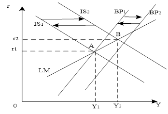 Рисунок 1.4 Достижение баланса в рамках модели Манделла Р.Манделл обнаружил, что фискальная и кредитно-денежная политика оказывают различное относительное воздействие и доказал, что при фиксированном обменном курсе кредитно-денежная политика имеет сравнительные преимущества в регулировании платежного баланса, а фискальная в регулировании внутреннего равновесия. Международное движение капитала в ответ на отклонение внутренней ставки процента от ее мирового значения позволяет странам достигать общего равновесия, не меняя обменного курса. Чем выше мобильность капитала, тем меньшее изменение ставки процента требуется для выравнивания платежного баланса. Предположим, что государство проводит стимулирующую фискальную политику в экономике с низкой мобильностью капитала (Рис. 1.5).