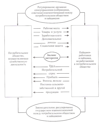 Рис.1. Механизм взаимодействия между па Интересы пайщиков как членов потребительского общества заключаются в следующем: - покупке в предприятиях потребительского общества качественных товаров и услуг на более выгодных условиях; - получении дополнительных доходов от экономического участия в деятельности потребительского общества; - сбыте потребительскому обществу сельскохозяйственной и другой продукции, произведенной в хозяйствах пайщиков-товаропроизводителей; - предоставлении потребительским обществам рабочих мест и заработной платы в размере, обеспечивающем пайщикам достойную жизнь; - социальной защите (в ней заинтересованы как пайщики-работники, так и пайщики, не работающие в потребительском обществе). Потребительское общество, стремясь выполнить социальную миссию, заинтересовано в том, чтобы пайщики активно участвовали в экономической деятельности потребительского общества: - покупали товары и услуги в предприятиях потребительского общества; - вносили паевые взносы и вклады для пополнения денежных средств общества; - поставляли (сдавали) потребительскому обществу сельскохозяйственную и другую продукцию. Потребительское общество также заинтересовано в том, чтобы работающие пайщики были квалифицированными работниками и добросовестно трудились в хозяйственных предприятиях - торговых, заготовительных, производственных, по оказанию услуг населению и др. Таким образом, экономическое участие пайщиков и экономическая деятельность потребительского общества осуществляются с учетом взаимных интересов. Взаимоотношения, обеспечивающие баланс экономических интересов между пайщиками и их потребительским обществами, регулируются законодательством и органами самоуправления потребительских обществ. Повышение экономического участия пайщиков в значительной степени зависит от условий, созданных государственными органами и организациями потребительской кооперации для установления взаимовыгодных экономических отношений между пайщиками и потребительскими обществами. Потребительское общество заинтересовано в активном экономическом участии пайщиков, так как это участие способствует более эффективной работе потребительского общества и получению дохода от хозяйственной деятельности. · Л.Е.Теплова «Основы потребительской кооперации (стр. 87-89)» · Л.А.Сипко; Г.М.Ефремова: методические рекомендации по организации и повышению эффективности экономического участия пайщиков и по кооперативным выплатам 2.2 Обоснование преимуществ экономического участия пайщиков в деятельности потребительского общества По экономическому участию всех пайщиков можно разделить на пайщиков-вкладчиков, пайщиков-покупателей, пайщиков-поставщиков, пайщиков-работников. Все пайщики принимают участие в формировании собственного имущества потребительского общества путем внесения имущественных паевых взносов (паев), поэтому каждый пайщик вправе ожидать получения дохода на внесенный пай (дивиденд). Пайщики-вкладчики . Пайщики вносят денежные вклады в потребительское общество, т. е. предоставляют ему кредиты. Такие пайщики являются пайщиками-вкладчиками. Они получают доход, установленный в процентах к сумме вклада. Значит, внесение вклада приносит пайщику дополнительный доход. Потребительское общество имеет от пайщика-вкладчика 