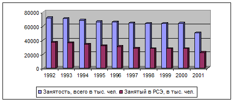 Рис. 1.1.1. Динамика отношения среднесписочной численности работников реального сектора экономики к совокупному объему занятых в экономике РФ 1992–2001 гг. – общему падению ВВП до 1999 г. соответствует подобное снижение доли реального сектора экономики в его образовании с 49, 2% в 1992 г. до 42, 3 в 1998 г.; – неравномерное распределение создаваемого совокупного конечного продукта среди отраслей данного сектора, отраженном в значительном перевесе доли промышленного производства, особенно в топливной промышленности – нефтяная и газовая отрасли; – сельское и лесное хозяйство выражают собой самые депрессивные отрасли из представленных.