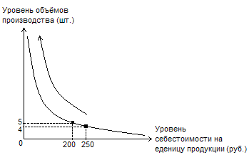График №1: Зависимость между уровнем объема производства и уровнем себестоимости на единицу продукции при чисто экстенсивном повышении ресурсоотдачи Но эта зависимость верна, если общая или полная себестоимость товарной продукции – фиксированный показатель. Предположим, что он также изменяется, как объем производства и себестоимость на единицу продукции. А его изменение зависит от ряда условий. Такая модель будет отклонением от абсолютности повышения ресурсоотдачи экстенсивным результатом. Значит, она будет иметь не канонический характер[10] , а характер частных возможностей[11] , что, конечно, будет больше отражать возможную действительность. Рассмотрим нефиксированность полной себестоимости товарной продукции. Следовательно, он может отклоняться как в «+», так и в «-». Тогда неизменчивость данного показателя означает наличие частного канонического случая. Отклонение полной себестоимости товарной продукции в «+» Предположим, что на предприятии случай в «+», значит произошло увеличение объемов производства или себестоимости на единицу продукции. В любом случае, если увеличится себестоимость на единицу продукции, то это повлечет за собой самое пагубное воздействие на производство предприятия. Так как уменьшится прибыль с реализации единицы продукции. Тогда единственный способ увеличить прибыль – это увеличить цену или уровень реализации до такой степени, пока совокупный доход предприятия не сровняется с первоначальным доходом при старом уровне реализации, цены и себестоимости продукции. Но если увеличивать цену, то мы неминуемо столкнемся с проблемой эластичности спроса на производимый товар, а значит мы можем повлечь за собой снижение уровня реализации. Тем самым мы увеличим уровень убытка от нереализации. Это означает, что такая политика целесообразна только в одном случае – когда не нарушается такое неравенство: Уровень прибыли с учетом убытка от нереализации в связи с увеличением цены в результате увеличения себестоимости ≥ старый уровень прибыли без увеличения цены, но с увеличенной себестоимостью. В противном случае любое телодвижение подобного характера является идиотизмом. К примеру: предприятие произвело 4 изделия, общая себестоимость которых – 1000 рублей. Предположим, полная себестоимость данной товарной продукции из-за влияния неких факторов стала 1050 рублей. Следовательно, себестоимость на единицу продукции с 1000 рублей / 4 изделия = 250 рублей, стала 1050 рублей / 4 изделий = 262,5 рублей. Но уровень реализации остался прежним – 4 изделия. Предприятие реализовывало продукцию по 300 рублей. Тогда можно вывести уровень прибыли – 4*300 - 4*250 = 200; с учетом изменения себестоимости – 4*300 - 4*262,5 = 150. Ради минимизации убытка связанного с повышением себестоимости предприятие повышает цену на свой товар до 350 рублей. Тогда спрос на данную продукцию снизился, поэтому уровень реализации уменьшился с 4 до 3 единиц. В связи с принятием решения об увеличении цены уровень прибыли становится 3*350 - 4*262,5 = 0. Сравним результаты уровня прибыли при повышенной себестоимости, но стабильной цене и уровень прибыли при повышенной себестоимости + повышенной цене – 4*300 - 4*262,5 = 150 > 3*350 - 4*262,5 = 0. Вывод: бездействие и смирение оказалось бы лучшим решением, чем попытка продать товар по более высокой цене. Но, что если повысить цену на меньшее число