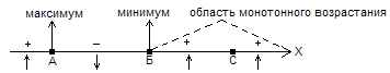 Итак мы видим, что если подставить вместо (x) в производную от функции ряда f(x) число, расположенное на отрезке от -∞ до А, не включая само А, то можно сделать вывод, что функциональный ряд от -∞ до А возрастает. Аналогичным способом узнается возрастание и убывание на отрезках от А до Б, от Б до С, от С до +∞. Следовательно, на данном отрезке есть следующие возрастания и убывания. Возрастание отмечается как «↑», а убывание «↓».