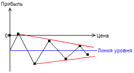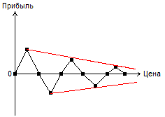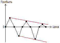 · Абсолютно цикличный, т.е. такой вид рядов динамики изменения прибыли по показателю «цена», при котором можно наблюдать через какой-то момент или сразу абсолютное повторение положения отрезка любого из вышеперечисленных графиков (то есть последующий участок графика точно такой же, как и сравниваемый из ранее наблюдаемых участков). · Относительно цикличный, т.е. такой вид рядов динамики изменения прибыли по показателю «цена», при котором можно наблюдать через какой-то момент или сразу относительное повторение положения отрезка любого из вышеперечисленных графиков (то есть последующий участок графика точно такой же, как старый сравниваемый, но имеет свои дополнительные особенные черты: разницу в некий коэффициент по отношению к нарастанию, сужению, растягиванию, затуханию; высоту расположения по отношению к уровню прибыли; наличие дополнительного элемента и т.д.). Как мы видим в данных рядах динамики можно отметить некие проявления тенденций, связанных с повышением цены. При пропорциональном движении ряда тенденция такова, что с последующим повышением цены прибыль будет лишь колебаться в пределах некой нормы, т.е. в пределах отрезка между средним максимальным значением и средним минимальным значением. При затухающем движении ряда тенденция принимает оборот стремления к стабилизации прибыли в некой точке, после которой последующее повышение цены не вызовет никакого колебания в прибыли. При нарастающем движении ряда тенденция динамики прибыли начинает разбухать, то есть начинают расти длины волн, что означает при последующем повышении цены: увеличение объема роста прибыли и (или) увеличение объемов роста убытков. При наличии эффекта растягивания - длинны волн не меняются, зато меняется длина периода циклов колебания рядов. Это означает, что с последующим повышением цены прибыль будет оставаться в пределах некой нормы, как в пропорциональном ряду, но скорость изменения прибыли будет снижаться. Другими словами, на последующее повышение цены реакция изменения прибыли уменьшается. При сужении рядов происходит обратная тенденция по отношению к растягиванию, то есть периоды колебаний начинают сужаться, а значит, при последующем повышении цены реакция изменения прибыли возрастает. Последующие вышеописанные модели (т.е. начиная с затухающе-нарастающей модели), за исключением цикличных, - есть симбиоз, в какой-то мере, первых пяти. А значит, тенденции, которые создают первые пять моделей остаются, за исключением того факта, что эти тенденции будут взаимодополняющие. К примеру, в модели затухающе - сужающейся есть две взаимодополняющих тенденции: на затухание и на сужение. Что касается цикличных моделей, то это модели, в которых некоторые тенденции имеют историческую повторяемость по отношению к динамике изменения цены. Эта повторяемость может быть абсолютной, то есть повторение полностью соответствует сравниваемому отрезку, или же относительным, где повторение имеет свою специфическую отличительную черту. Ряды, которые не подпадают ни под один вид вышеприведенных графиков, называются несистематическими рядами. Такие ряды на всем своем отрезке не имеют единой строгой тенденции, но эти тенденции могут проглядываться на различных отрезках этого ряда. Тогда некие закономерности, связанные с динамикой развития тенден