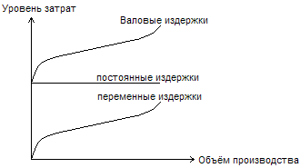 Сумма постоянных и переменных издержек называется валовыми издержками. На графике это суммирование выглядит как сдвиг переменных издержек на сумму постоянных.