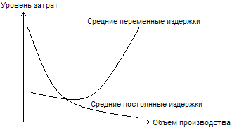 Согласно данному графику сначала затраты довольно высокие. Это связано с тем, что большие постоянные издержки распределяются на незначительном объеме произведенной продукции. По мере роста производства постоянные издержки распределяются на все большее число единиц готовой продукции, и средние издержки быстро падают, доходя до минимума в точке М. Но по мере роста объема производства основное влияние на средние издержки начинают оказывать не постоянные, а переменные затраты. Начинает сказываться закон убывающей производительности. Поэтому кривая начинает стремиться вверх. Также стоит отметить существование средних постоянных и переменных издержек. Средние постоянные издержки получаются путем деления суммы постоянных затрат на объем производства. Аналогичным образом получаются и средние переменные издержки. Следует обратить внимание, что постоянные издержки остаются неизменными на протяжении краткосрочного периода, поэтому по мере роста производства величина постоянных издержек распределяется на все большее число готовой продукции. Тем самым величина средних постоянных издержек убывает. Что касается средних переменных издержек, то они сначала ниже, чем средние постоянные издержки, но затем начинают возрастать, быстро обгоняя средние постоянные издержки. И в дальнейшем они становятся неизмеримо высокими по отношению к средним постоянным издержкам, а их значение начинает стремиться к средним валовым издержкам.
