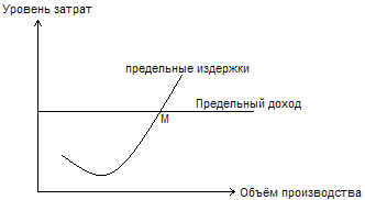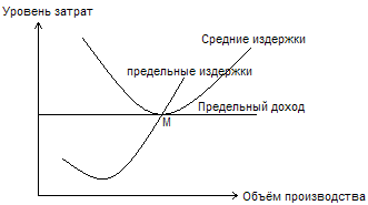 Стоит отметить, что аналогичным образом происходит и другого рода пересечение, где производство дополнительной единицы продукции с одной стороны порождает дополнительные затраты, а с другой - приносит и дополнительный доход (предельный доход), выручку от продажи продукции. Величина предельного дохода представляет собой разность между выручкой от продажи (n) и (n-1) единиц продукции. Другими словами, кривая предельного дохода строится аналогично как кривая предельных издержек и представляет собой прямую, параллельную оси объема. Введя понятия предельные издержки и доход, мы можем определить точку, отражающую определенный объем производства, при котором уровень прибыли будет наибольшим. И эта точка находится на пересечении двух этих кривых в точке М. Это связано с тем, что фирме рационально расширять производство, пока каждая дополнительно произведенная единица будет приносить дополнительную прибыль. В точке же пересечения кривых дополнительная прибыль равна нулю. Другими словами, пока предельные издержки будут меньше, чем предельный доход, компания может наращивать обороты. При превышении предельными издержками предельного дохода фирма начнет нести относительные убытки.