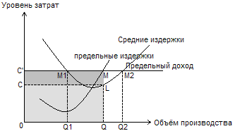 Во втором случае фирма будет получать максимальный уровень прибыли, если уровень производства будет на уровне точки М. При оптимальном объеме производства Q, соответствующим точки М, средние издержки будут равны С. Следовательно, валовые издержки будут соответствовать площади прямоугольника 0СLQ, а валовая выручка – 0С’MQ. Разность между этими прямоугольниками будет составлять ту самую максимальную прибыль, которой соответствует прямоугольник СС’ML. Стоит отметить, что максимальная прибыль будет получаться лишь при поддержании объема, соответствующего точки М. Любое отклонение в сторону увеличения или уменьшения неминуемо будет сокращать эту прибыль. Сокращение прибыли будет происходить до уровня объемов Q1 или Q2. При данных объемах средние издержки пересекают уровень предельного дохода в точках М1 и М2. Эти точки являются значениями, в которых организация не будет нести убытки, но и прибыли не получит. Поэтому дальнейшее продолжение тенденции уменьшения объема Q1 или увеличение объема Q2 будет приносить убытки.