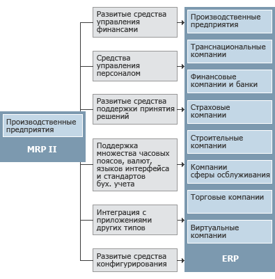 Рис. 2 Алгоритм производственного планирования по стандарту MRP II После этого этапа производится оценка, выполним ли полученный план, и если нет, то осуществляется возврат на начальный этап и планирование начинается заново.Формирование плана-графика выпуска продукции преобразует план производства в график выпуска продукции, представляющий собой среднесрочный объёмно-календарный план, задающий количества конкретных изделий (или партий) со сроками их изготовления. В планировании потребностей в материальных ресурсах определяются в количественном выражении и по срокам потребности в материальных ресурсах, необходимых для обеспечения графика выпуска продукции. Входными данными являются спецификации изделий (состав и количественные характеристики комплектующих конкретного изделия) и размер текущих материальных запасов. А результатом работы является расписание закупки и/или внутреннего производства всех необходимых материалов и комплектующих. В планировании потребностей в мощностях план производства преобразуется в конечные единицы загрузки рабочих мощностей (станков, рабочих, лабораторий и т.д.). Входными данными являются маршрутизация выпускаемых изделий и текущие заказы. После этого этапа производится оценка, осуществим ли производственный план, и если нет, то осуществляется возврат на формирование план-графика выпуска продукции или на более поздние этапы алгоритма и планирование начинается заново. Управление заказами клиентов выполняет сопоставление реальных потребностей клиентов с планами выпуска продукции. В управлении на уровне производственного цеха формируются оперативные планы-графики длительностью от нескольких дней до месяца. При оценке исполнения, по сути, оценивается реальное исполнение всех вышеперечисленных планов с тем, чтобы внести корректировки во все предыдущие циклы планирования. При этом можно обсуждать и решать возникающие проблемы с поставщиками комплектующих материалов, дилерами и партнерами, изменять отдельные планы, оказавшиеся невыполнимыми и подлежащие пересмотру. С каждого из трёх последних этапов можно вернуться к любому из этапов планирования производственного процесса. Стандарт APICS на системы класса MRP II содержит описание 16 групп функций (функциональных блоков) системы: · Sales and Operation Planning (Планирование продаж и производства). · Demand Management (Управление спросом). · Master Production Scheduling (Составление плана производства). · Material Requirements Planning (Планирование материальных потребностей). · Bill of Materials (Спецификации продуктов). · Inventory Transaction Subsystem (Управление складом). · Scheduled Receipts Subsystem (Плановые поставки). · Shop Plow Control (Управление на уровне производственного цеха). · Capacity Requirements Planning (Планирование потребностей в мощностях). · Input/output control (Контроль входа/выхода). · Purchasing (Материально-техническое снабжение). · Distribution Resource Planning (Планирование ресурсов распределения). · Tooling Planning and Control (Планирование и управление инструментарием). · Financial Planning (Управление финансами). · Simulation (Моделирование). · Performance Measurement (Оценка результатов деятельности). Следующий этап развития КИС представлен системами ERP (Enterprise Resources Planning) – это системы комплексного планирования ресурсов предприятия. Если системы MRP II используются для планирования исключительно ресурсов производства, то системы ERP занимаются планированием всех р