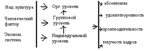 ОП представляет собой 3-х уровневую модель, в которой каждый последующий уровень базируется на предыдущем. Человек, приходя в орг-ю имеет свои черты характера и устоявшиеся модели поведения. Он становится членом группы, которая представляется ему с одной стороны свободой и развивает его способности, а с другой – накладывает на человека ограничения. То же касается и орг-ии в целом. 1. Эконом. система:Человеческий капитал: 1) проф. подготовка и квалификация 2) трудовой опыт и традиции 3) общая культура и культура труда 4) соц.-псих. качества человека 5) здоровье и работоспособность Наиболее эффективными сферами вложения в человеческий капитал в разных странах считают: 1) здравоохранение и соц. обеспечение 2) образование 3) трудовая миграция 2. Национальная культура Учет культурных различий необходим. Т.к организационное поведение в различных культурах имеет отличие, которое определяет многообразие отношений и элементов. Можно выделить 5 основных характеристик: 1. Взаимосвязь с окр. средой · люди зависимы от окр. среды · люди живут в гармонии с окр. средой · люди господствуют над окр. средой 2. Временная ориентация · ориентация на прошлое · ориентация на настоящее · ориентация на будущее 3. Природа людей · люди добрые · люди не добрые · люди м/б как добрыми, так и не добрыми 4. Ориентация деятельности · действие · существование · контролирование 5. Направленность ответственности · индивидуалисты · группа · иерархия 6. Пространственная ориентация · уединенность · открытость · смешанный характер 6. ВЫХОДЯЩИЕ ХАРАКТЕРИСТИКИ ОП 1) производительность включает в себя продуктивность и эффективность. Предприятия работают продуктивно, если продукция пользуется спросом и доля его на рынке высока. Однако производительность будет зависеть от эффективности достижения предприятием своих целей (прибыль, выработка в ед. времени). 2) абсентеизм (отсутствующий) Пр.: конвеер. Уровень абсентеизма, превышающий допускаемый влияет на эффективность и на продуктивность работы на предприятии с усложнением технологических процессов и введением более сложного оборудования 3) текучесть кадров (затраты на отбор персонала, но на вакантное место могут прийти более подготовленные кадры) 4) удовлетворенность Для измерения уровня удовлетворенности можно воспользоваться двумя подходами: 1. метод единой оценки: Полностью не удовлетворен _______________________Полностью удовлетворен 2. суммирование оценок удовлетворенности различными сторонами работы: · самореализация в работе · характер контроля · справедливое вознаграждение · условия труда · соответствие работы типу личности · психологический климат Выходные элементы ОП дают реальную возможность проводить анализ эффективности внедрения многих мероприятий по совершенствованию работы с персоналом и изменениям работы внутри организации. 7. ОСОБЕННОСТИ ОБМЕНА ИНФОРМАЦИЕЙ В КОММУНИКАЦИОННОМ ПРОЦЕССЕ Процесс коммуникации представляет собой процесс обмена информацией. Именно потому, что обмен информацией встроен во все основные виды управленческой деятельности, мы называем коммуникации связующим процессом. А одним из важных инструментов управления в руках менеджера является находящаяся в его распоряжении информация. Используя и передавая эту информацию, а также получая обратные сигналы, он организует, руководит и мот