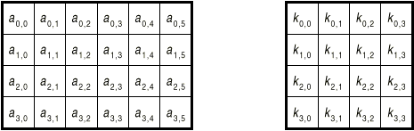 Рисунок 1.4. Пример представления Состояния (Nb=6) и Ключа шифрования (Nk=4). В некоторых случаях ключ шифрования показан как линейный массив 4-байтовых слов. Слова состоят из 4 байтов, которые находятся в одном столбце (при представлении в виде прямоугольного массива) как показано на рисунке 1.4 взятый с [11]. Входные данные для шифра ("открытый текст", если используется режим шифрования ECB) обозначаются как байты состояния в порядке a0,0, a1,0, a3,0, a0,1, a1,1, a3,1 ,a4,1 ... После завершения действия шифра выходные данные получаются из байтов состояния в том же порядке. Число циклов обозначено как Nr и зависит от значений Nb и Nk. Оно приведено в Таблице 1.2