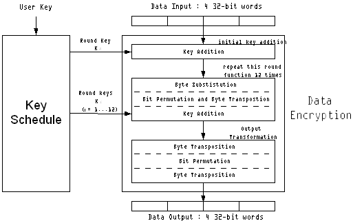 Рисунок 1.9 Расширение ключа и выбор циклового ключа для Nb=6 и Nk=4. Алгоритм выработки ключей можно осуществлять и без использования массива W[Nb*(Nr+1)]. Для реализаций, в которых существенно требование к занимаемой памяти, цикловые ключи могут вычисляться на лету посредством использования буфера из Nk слов. Шифр Rijndael состоит из: - Начального добавления циклового ключа; - Nr-1 циклов; - заключительного цикла. На псевдо-Си это выглядит следующим образом: Rijndael (State, CipherKey) { KeyExpansion(CipherKey, ExpandedKey); // Расширениеключа AddRoundKey(State, ExpandedKey); // Добавлениецикловогоключа For ( i=1 ; i<Nr ; i++) Round(State,ExpandedKey+Nb*i); // циклы FinalRound(State, ExpandedKey+Nb*Nr); // заключительныйцикл } Если предварительно выполнена процедура расширения ключа, то Rijndael будет выглядеть следующим образом: Rijndael (State, CipherKey) { AddRoundKey(State, ExpandedKey); For ( i=1 ; i<Nr ; i++) Round(State,ExpandedKey+Nb*i); FinalRound(State, ExpandedKey+Nb*Nr); } Расширенный ключ должен всегда получаться из ключа шифрования и никогда не указывается напрямую. Нет никаких ограничений на выбор ключа шифрования. 1.2.2 Анализ симметричного блочного шифра DEAL DEAL (DataEncryptionAlgorithmwithLargerblocks - Алгоритм Шифрования Данных с Укрупненными блоками) является 128-и битным блочным шифром с размерами ключа 128, 192 и 256 бит, что далее здесь будет обозначаться DEAL-128, DEAL-192 и DEAL-256 соответственно [12]. Все версии могут использоваться в любом из четырех стандартных режимах DES'a. Мы начнем с описания работы DEAL в режиме ECB. Пусть С = ЕВ (А) означает зашифрованное DES значение 64-х битного А на ключе В, и пусть Y = EAZ (X) означает зашифрование DEAL 128-и битного X на ключе Z. Открытый текст Р разделяется на блоки Pi по 128 бит каждый, P = P1 , P2 , …, Рn . Расписание ключей принимает ключ К и возвращает r ключей DESRKi , где i = 1, … , r, как описано ниже. Обозначим XL и XR левую и правую части X соответственно. Шифр-текст вычисляется следующим образом. Положим X0 L = Pi L , X0 R = Рi R и вычислим для j= 1, … ,r Xj L =ERKj (XL j -1 ) XR j -1 (1.9) XR j = XL j -1 (1.10)