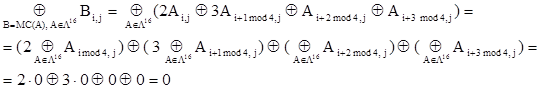 2.2 Алгоритм реализации интегральной атаки на БСШ CryptonВ данном разделе описана специфичная для шифра Crypton интегральная атака [22]. Представлено математическое обоснование базовой атаки на 4 раунда. Интегральная атака основана на возможности свободного подбора атакующим некоторого набора открытых текстов для последующего их зашифрования. Эта атака для 4-раундового шифра Crypton (стандарт Crypton включает в себя 12 раундов) эффективнее, чем полный перебор по всему ключевому пространству. Введем определения. Λ-набор – набор из 256 входных блоков (массивов State), каждый из которых имеет байты (назовем их активными), значения которых различны для всех 256 блоков. Остальные байты (пассивные) остаются одинаковыми для всех 256 блоков из Λ-набора. Т.е. Λk – Λ-набор c k активными байтами. Pr – множество состояний в конце раунда r. Возьмем Λ-набор и проследим его изменение в течении нескольких раундов. После элементарных преобразований BS и KA блоки Λ-набора дадут в результате другой Λ-набор с активными байтами в тех же позициях, что и у исходного. Преобразование SR сместит эти байты соответственно заданным в ней смещениям. После преобразования MC Λ-набор в общем случае необязательно останется Λ-набором (т. е. результат операции может перестать удовлетворять определению Λ-набора). Но поскольку каждый байт Рассмотрим шифрование Λ1 -набора, во всех блоках которого активен только один байт. Т.е. значение этого байта различно во всех 256 блоках, а остальные байты одинаковы. Проследим эволюцию этого байта на протяжении трех раундов. В первом раунде преобразование MC преобразует один активный байт в столбец из 4 активных байт, т.е. P1 является Λ4 . Во втором раунде эти 4 байта разойдутся по 4 различным столбцам в результате преобразования SR, P2 является Λ16 . Преобразование MC следующего, третьего раунда преобразует эти байты в 4 столбца, содержащие активные байты. Этот набор все еще остается Λ-набором до того момента, когда он поступает на вход MC третьего раунда. Основное свойство Λ-набора – поразрядная сумма по модулю 2 ( Рассмотрим теперь результат преобразования MC в третьем раунде байтов входного массива данных A в байты выходного массива данных B. Покажем, что и в этом случае поразрядная сумма всех блоков выходного набора будет равна нулю, то есть: