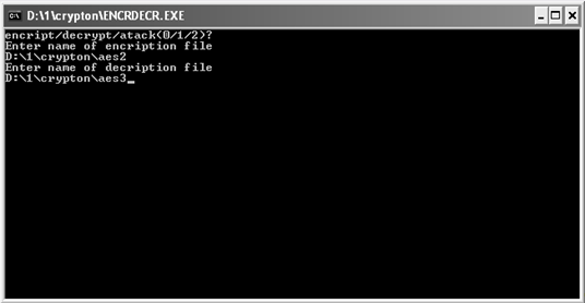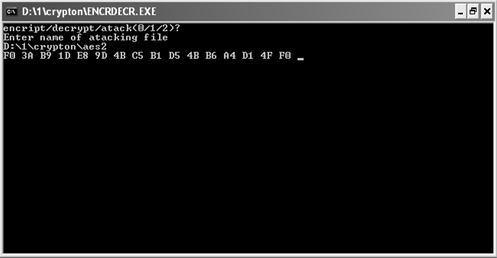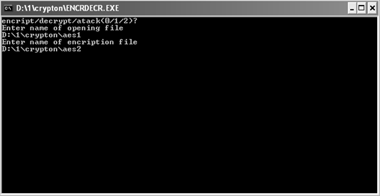 . При Если предполагаемое значение байта ключа было верно, то оно будет включено в возможные варианты на место 2.3 Описание программной реализации Разработанный в рамках дипломной работы программный продукт представляет собой реализацию шифрования и расшифрования данных с использованием алгоритма Cryptonи реализацию интегральной атаки. Системные требования - компьютер на базе IntelPentium и выше, ОС - Windows 95 + IE 4.0 и выше. Программный продукт выполняет следующие операции: - зашифрование входных данных в криптограму; - расшифрование криптограммы; - нахождение 128 – битного ключа. Операция зашифрования выполняется следующим образом: 1. Запускаем файл ENCRDECR.EXE получаем на экране Рис.2.1 2. Нажатием кнопки "0" выбираем функцию зашифрования; 3. Указываем путь к файлу который необходимо зашифровать и путь где разместить криптограму Рис. 2.2