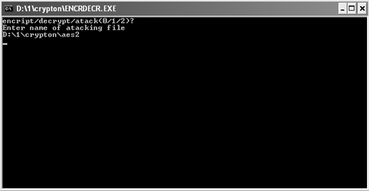 Рисунок 2.3 Операция расшифрования 5. По указаному пути мы получим исходные данные. Операция нахождения ключа выполняется следующим образом: 1. Запускаем файл ENCRDECR.EXE получаем на экране Рис.2.1 2. Нажатием кнопки "2" выбираем функцию атаки; 3. Указываем путь к криптограме Рис. 2.4