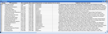 Рис. 2.27 – Результат виконання представлення даних SQL-код представлення даних: SELECT Hudogniki.fio, Hudogniki.epoha, Epohi.period, Epohi.cherti,; Kartini.name, Kartini.museum, Museums.place; FROM ; givopis!epohi ; INNER JOIN givopis!hudogniki ; ON Epohi.name = Hudogniki.epoha ; INNER JOIN givopis!kartini ; ON Hudogniki.fio = Kartini.fio; AND Epohi.name = Kartini.epoha ; INNER JOIN givopis!museums ; ON Museums.name = Kartini.museum Звіт – це документ, при перегляді якого, видно, яка інформація зберігається у базі даних, тобто це форматоване представлення даних, яке виводиться на екран, принтер чи у файл. В звіті можна показати як часткову інформацію про данні, так і повну. Його можна представити у різному оформленні, в залежності від бажання користувача. Використовуючи Wizard, створюємо спочатку звичайний звіт, а потім звіт один-до-багатьох. У звичайному звіті обираємо таблицю для побудови звіту, способи сортування записів та опції підведення підсумків та зберігаємо звіт у вказаний каталог з подальшим редагуванням. Після збереження звіту відкриється вікно редактора звітів, у якому редагуємо необхідні параметри (рис. 2.29). При бажанні звіт можна також розпечатати.