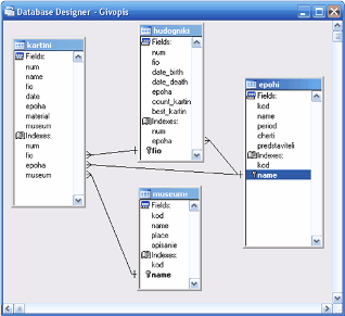 Рис. 2.15 – Заповнена даними таблиця museums 2.1.4 Встановлення зв’язків між таблицямиУ вікні Database designer відкриваємо створені раніше таблиці та встановлюємо необхідні для роботи зв’язки, використовуючи створені на попередньому етапі індекси. Схема зв’язків між таблицями показана на рис. 2.16.