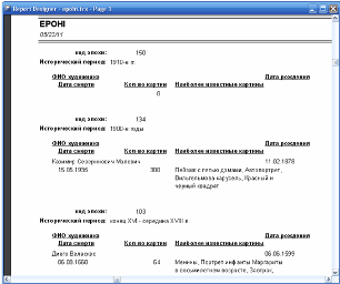 Рис. 2.30 – Фрагмент звіту «Картини» Для створення звіту один-до-багатьох - епохи - обираємо батьківську таблицю, дочірню таблицю та індекси, за якими таблиці зв'язуватимуться. Зберігаємо звіт з подальшим редагуванням у конструкторі (рис. 2.31).