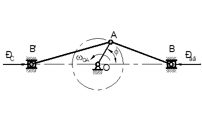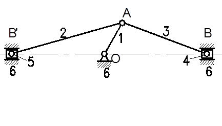 Рис. 1. Структурная схема рычажного механизма Исходные данные для расчета Размеры звеньев Масса звеньев ОА = 140 мм,mOA = 27 кг, АВ = 150 мм,mA В = mАВ' = 20 кг, AB'= 150 мм.mВ = mВ' = 8,5 кг. Частота вращения кривошипа nOA = 350 об/мин, wOA = const. Угол расчетного положения кривошипа j = 60°. Движущая сила Рдв = 5500 Н. Сила полезного сопротивления Рс = 4200 Н. 1.2 Классификация кинематических пар по четырём признакам Кинематической парой называется подвижное соединение двух звеньев, ограничивающее их относительное движение. Кинематические пары механизма показаны на рис. 2.