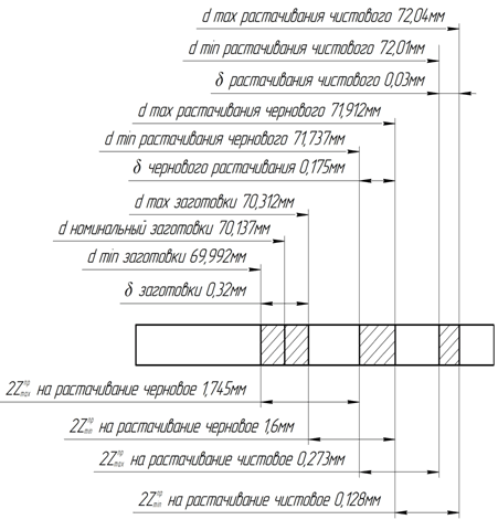 = для заготовки δ3 =320мкм. Определяем предельные размеры перехода: для чистового Dmax =72,04мм; Dmin =72,04– 0,030=72,01мм, для чернового Dmax =71,912 мм; Dmin =71,912 – 0,175=71,737 мм, для заготовки Dmax =70,312 мм; Dmin =70,312 – 0,32=69,992 мм. Предельные значения припусков для чистового растачивания: 2Ζmin 2 =72,04– 71,912 =0,128мм=128мкм, 2Zmax 2 =72,01– 71,739 =0,273мм=273мкм. Предельные значения припусков для чернового растачивания: 2Zmin 1 =71,912 – 70,312 =1,6мм=1600мкм, 2Zmax 1 =71,737 – 69,992 =1,745мм=1745мкм. На основании расчетов строим схему допусков и припусков (рис.1). Общие припуски: 2Z0 min =128+1600=1728мкм, 2Z0 max =273+1745=2018мкм. Общий номинальный припуск: Z0 ном =Z0 min +В3 – В0 . (6) Z0 ном =dд ном – z0 ном . (7) Подставляем значения и получаем: Z0 ном =1728+175 – 30=1873мкм, d3 ном =72,01– 1,873=70,137мм. Производим проверку расчетов: Zmax 2 – Zmin 2 =273– 128=145мкм, δ1 – δ2 =175 – 30=145мкм, Zmax 1 – Zmin 1 =1745– 1600=145мкм, δ3 – δ1 =320– 175=145мкм.