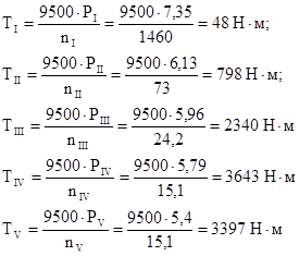 Уточняем частоты вращения валов nI = nэд = 1460 мин-1 nII = nI / uч = 1460 / 20 = 73 мин-1 nIII = nII / uц = 73 / 3 = 24,2 мин-1 nIV = nIII / uк = 24,2 / 1,6 = 15,1 мин-1 nV = nIV = 15,1 мин-1 Определяем мощности на валах привода РV = 5,4 кВт РIV = РV / (ηк · ηп ) = 5,4 / (0,94 · 0,99) = 5,79 кВт РIII = РVI / (ηм · ηп ) = 5,79 / (0,98 · 0,99) = 5,96 кВт РII = РIII / (ηц · ηп ) = 5,96 / (0,98 · 0,99) = 6,13 кВт РI = РII / (ηч · ηп ) = 6,13 / (0,84 · 0,99) = 7,35 кВт РЭ = РI / ηм = 7,35 / 0,98 = 7,49 кВт Определяем вращающие моменты на валах