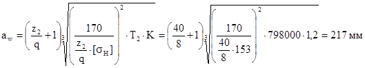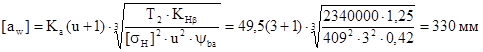 где sHlimb – предел контактной выносливости sHlimb = 2×HB + 70 = 2 × 210 + 70 = 490 МПа КHL = 1 [2, с. 33] – коэффициент долговечности; [SH ] = 1,2 [2, с. 33] – коэффициент безопасности. Определяем предварительное межосевое расстояние исходя из условия обеспечения достаточной контактной выносливости активных поверхностей зубьев