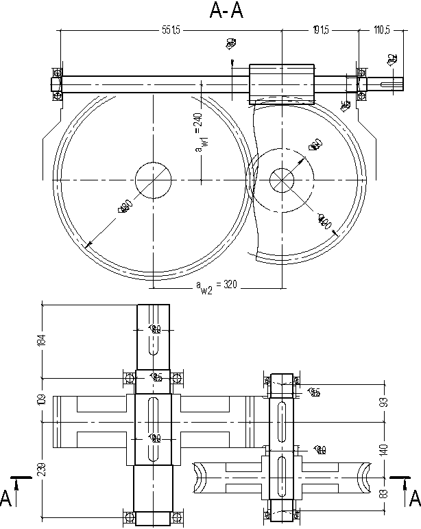 По ГОСТ 9563-60* принимаем модуль зацепления m = 8 мм [2, с. 36]. Определяем делительные диаметры колес z1 и z2 d1 = mz1 = 8×20 = 160 мм d2 = mz2 = 8×60 = 480 мм Уточняем межосевое расстояние |