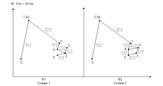2.2 Предварительная наметка конфигурации линииНа базе данных о географическом расположении пунктов потребления электроэнергии и их нагрузках намечаем две схемы распределения мощностей. Схема сети СВН в первом варианте состоит из двухцепных линий от С и ГЭС. В данном варианте схемы одноцепные линии не применяются, а во втором варианте сеть изменена и представлена в виде кольца на напряжение 220 кВпо линиям к потребителям, состоящего из одноцепных линий. Передача мощности от ГЭС и С осуществляется к ПС1 по двухцепной линии на 500 кВ, к оставшимся потребителям передача мощности осуществляется по линиям на напряжение500 220 и 110 кВ исходя из кратчайших расстояний. Напряжения на линиях в обеих схемах представлены нарис.1.