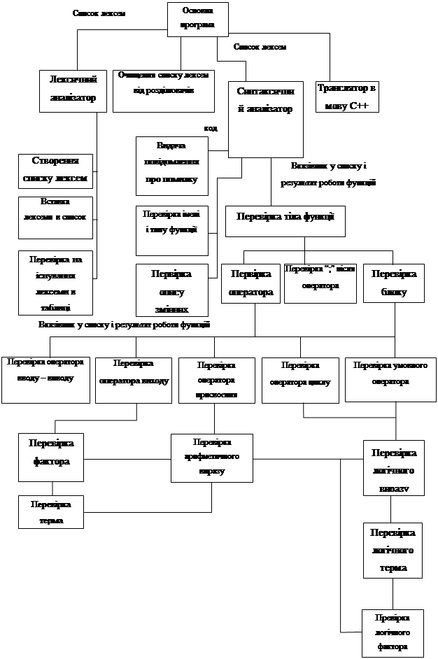 Рисунок 2 Конструкції while мови С При знаходженні ключового слова while перевіряється наявність дужки і викликається процедура перевірки запису виразу. При перегляді виразу методом операторного передування лексеми проглядаються в обох напрямках, якщо це потрібно і визначається, чи порядок їх співпадає з описаними конструкціями. На етапі синтаксичного аналізу визначаються помилки. Після того, як синтаксис оператора визначено, іде інтерпретація його значення, тобто семантичний аналіз. Кожній синтаксичній одиниці відповідає певне значення, яке може бути виражене в формі реальних входів або в проміжній формі. Проміжною формою синтаксичної конструкції є дерево розбору. Після синтаксичного і семантичного аналізу тексту програми відбувається трансляція тексту в проміжну мову, якою у більшості випадків є асемблер. Трансляція тексту може відбуватись як за один, так і за декілька проходів. Перевагою однопрохідних компіляторів є те, що не потрібно підтримувати зв’язок між проходами, але недоліком є те, що всі змінні, функції, мітки і константи мусять обов’язково бути описані перед їх використанням. Вибір структур вхідних данихПроцес компіляції вхідного файлу можна розділити умовно на кілька етапів. Основні етапи – це лексичний, синтаксичний та семантичний аналіз та трансляція. На кожному з цих етапів дані представляються у зручному для обробки вигляді. Для лексичного аналізу вхідними даними є текстовий файл. Лексичний аналізатор формує динамічний список в основній пам'яті, в якому кожен вузол містить як інформацію про лексему, так і вказівник на наступну лексему. Останній вказівник має значення NULL. Структура вузла списку: NODE { int line;– номер рядка лексеми int idlexem;– код лексеми (номер у таблиці) int type;– тип, якщо це ідентифікатор int is_int;– чи це ідентифікатор, чи рядкова константа, чи число int is_ar;– кількість індексів масиву (для простої змінної – 0) NODE* next; }– вказівник на наступний елемент списку Кожен ідентифікатор, не знайдений в таблиці лексем, записується в таблицю лексем, що є двовимірним символьним масивом. Паралельно існує масив вказівників на список параметрів, в якому всі елементи, що відповідають функції, мають вказівник на список параметрів функції. Структура вузла цього списку: FPAR { int type;– тип параметра (1..4) FPAR* next; }– вказівник на наступний елемент списку Список лексем є вхідним для синтаксичного аналізатора, який є суміщений з семантичним. На виході синтаксичного аналізатора є інформація про аналіз, що записується у файл. Це є повідомлення про першу знайдену помилку або ж повідомлення про те, що помилок немає. Якщо помилки немає, запускається транслятор, який транслює список лексем у файл на проміжній мові С++ відповідно до таблиці С-лексем і правил побудови вхідної мови. Порміжний файл з розширенням с транслюється у ехе-файл стандартним компілятором bсс.ехе. 3.1.1 Розробка блок-схеми програмиДля побудови компілятора необхідно спроектувати його будову на рівні функцій і їх взаємозв'язків, тобто правил виклику. Це потрібно для побудови узгодженої багатомодульної структури при програмуванні зверху вниз. Кожну задачу розділяємо на дрібніші підзадачі, які потім в свою чергу уконкретнюємо. Загальну структуру програми можна подати в такому спрощеному вигляді: