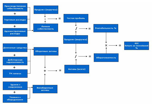 Взаимосвязь: 1. Высокие темпы инвестиций во внеоборотные активы на промышленных предприятиях могут привести к дефициту собственных оборотных средств, снижению платежеспособности и снижению эффективности основной деятельности (снижение объемов, увеличение затрат). С другой стороны, отказ от инвестиций может привести к остановке производства, снижения качества продукции и потери конкурентоспособности. 2. При привлечении дополнительных источников финансирования, в условиях ограниченного рынка, не будет возможности эффективно инвестировать в компанию, получить дополнительную прибыль и погасить проценты. В этом случае компания получает убытки. В случае если рынок растет, отсутствие дополнительных источников финансирования приведет к упущенной выгоде. 3. Повышение эффективности основной деятельности также должно быть согласовано с инвестиционной и финансовой деятельностью (количество оборотных средств, необходимы ли дополнительные мощности, источники финансирования). Искусство управления компанией и бизнесом заключается в нахождении баланса между основными составляющими бизнеса (инвестиционной, основной и финансовой деятельности). ВДОПОЛНЕНИЕ ROI – Return on investment. Рентабельность инвестиций. Коэффициент ROI рассчитывается как произведение рентабельности продаж на оборачиваемость активов. Каждый из этих двух показателей в свою очередь раскладывается на группы факторов, совместное действие которых влияет на конкретные значения показателей. Схема расчета коэффициента ROI: