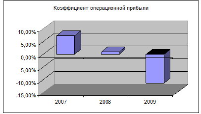 Рассчитанные значения показателей операционной прибыли позволяют сделать вывод, что эффективность деятельности компании в 2008 году с точки зрения операционной прибыли снизилась еще более существенно по сравнению с показателем валового дохода, что свидетельствует об излишних коммерческих и административных расходах. В 2009 году за счет снижения коммерческих расходов ситуация относительно улучшилась, но на темпы снижения коэффициента операционной прибыли это не повлияло.