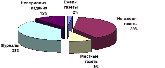 Рисунок 2 – Удельный вес печатной продукции в зависимости от периодичности издания в 2007 г. Для оптимальной насыщенности продаваемой продукции проводится упорядочивание ассортимента: выявляются и исключаются те виды товаров, качество которых не соответствует предъявляемым требованиям, чтобы не потерять доверие покупателей. ОАО "Новости" постоянно работает над расширением розничной сети, над обновлением своих киосков, создает новые, уютные и легко доступные для жителей г.Улан-Удэ торговые точки. Бухгалтерский учет на предприятии осуществляется бухгалтерией, являющейся самостоятельным структурным подразделением данного предприятия. На предприятии существует централизованная система учета, т.е все работы по текущему обобщению и систематизации информации, составлению бухгалтерских отчетов, экономическому анализу и контролю сосредоточиваются в едином подразделении предприятия. Это обеспечивает возможность рационального разделения труда и организации действенного контроля со стороны учетного аппарата за работой производственных подразделений. Бухгалтерию возглавляет главный бухгалтер, а в его отсутствие зам. главного бухгалтера, которые обеспечивают правильную постановку бухгалтерского учета и финансовой деятельности, достоверность и оперативность учета отчетности, контроль за сохранностью имущества предприятия, рациональное использование финансовых, денежных и материальных средств. Обязанности и права бухгалтеров определены в должностных инструкциях, а также при приеме на работу, в приказе. Автоматизация учета осуществляется на платформе программ семейства «1С». Автоматизирован учет кассы, расчеты через банк, учет ТМЦ, учет расчетов с поставщиками и покупателями, учет заработной платы. Работа по обработке товародвижения с розничными торговыми точками (киосками) ведется как с удаленными неавтоматизированными торговыми точками. Бухгалтерский учет ведется по журнально-ордерной форме учета (с применением компьютерной техники). Учет имущества, обязательств и хозяйственных операций ведется способом двойной записи в соответствии с рабочим планом счетов бухгалтерского учёта. Основанием для записей в регистрах бухгалтерского учёта являются первичные документы, фиксирующие факт совершения хозяйственной операции, а также расчёты бухгалтерии. Бухгалтерский учёт осуществляется бухгалтерской службой согласно п.2 ст.6 Закона № 129-ФЗ. Для своевременного получения финансового результата работы предприятия устанавливается дата сдачи материальных отчетов не позднее 5-го числа месяца, следующего за отчетным. В целях обеспечения достоверности данных бухгалтерского учёта и отчетности производится инвентаризация: 1) материальных остатков на оптовых складах - ежеквартально; 2) материальных и денежных остатков розничных торговых точек – по плану ревизионного отдела , либо по решению руководителя; 3) обязательная инвентаризация производится в случаях, предусмотренных ст.12 Закона № 129-ФЗ. Правила документооборота на предприятии регламентируются Положением о документах и документообороте в бухгалтерском учете. Эти правила увязаны с формами бухгалтерского и управленческого учета на предприятии. На предприятии функционирует торговый (коммерческий) отдел. Отдел возглавляется коммерческим директором. В сост