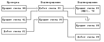 Рис. 1. Система взаимосвязи счетов бухгалтерского учета цикла реализации и формирования финансового результата При проведении аудита продаж в розничной торговле уделяется внимание следующим аспектам. 1. Проверка наличия и правильности оформления ценников на реализуемые товары. В соответствии со ст. 492 Гражданского кодекса РФ "по договору розничной купли-продажи продавец, осуществляющий предпринимательскую деятельность по продаже товаров в розницу, обязуется передать товар, предназначенный для личного, семейного, домашнего или иного использования, не связанного с предпринимательской деятельностью". Этот договор считается заключенным между торговым предприятием и покупателем с момента выдачи продавцом покупателю кассового или товарного чека или иного документа, подтверждающего оплату товара. При этом публичным договором между продавцом и покупателем в организациях розничной торговли являются ценники. В этой связи проверка правильности их оформления является необходимой. Ценник должен быть оформлен в соответствии с Письмом Роскомторга "О порядке оформления ценников на реализуемые товары". 2. Контроль правильности применения контрольно-кассовых машин при осуществлении расчетов с покупателями. Магазины розничной торговли обязаны использовать для расчетов с потребителями контрольно-кассовые аппараты, которые должны быть зарегистрированы в налоговом органе. Подтверждением регистрации служит карточка регистрации контрольно-кассовой машины, которая должна храниться в организации в течение всего времени эксплуатации такого оборудования. 3. Аудит правильности отражения операций продажи товаров на соответствие учетной политике и действующему законодательству. ОАО «Новости» отражает в оптовом учете по покупным ценам, в розничном учете товары по продажным ценам. Таблица 1. Схема аудита хозяйственных операций по продаже товаров в розницу (при применении журнально-ордерной формы бухгалтерского учета)
