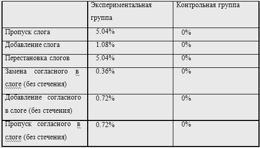 Количественный и качественный анализ экспериментальных данных показал, что все нарушения звукослоговой структуры можно разделить на два направления: нарушения звуковой наполняемости и слоговой структуры. Исходя из результатов исследования, можно выделить специфическую особенность состояния звукослоговой структуры слов у старших дошкольников без речевой патологии: все ошибки у них характеризовались нарушением звуковой структуры. Нарушение слоговой структуры у этих детей не наблюдалось. У всех испытуемых экспериментальной группы были выявлены ошибки по двум направлениям одновременно. Нарушение слоговой структуры у этих детей проявлялось в пропусках слогов, добавлении слогов, перестановке слогов, замене согласного в слоге, добавлении или пропуске согласного в слоге. Однако, наиболее распространенными у них были ошибки, связанные со звуковой наполняемостью. Эти ошибки проявлялись в добавлении согласного в стечение, пропуске согласного в стечении, замене согласного в стечении, перестановке согласных в стечении, замене согласного в слоге, пропуске или добавлении согласного в слоге. Анализируя ошибки звуковой структуры, можно отметить, что наиболее распространенной ошибкой среди испытуемых обеих групп были пропуски согласного в стечении. Однако, у испытуемых экспериментальной группы эти ошибки встречались приблизительно в 7 раз чаще, чем у испытуемых контрольной группы (см. таблицу 2). Таблица 2 Сравнительный качественный анализ ошибок упрощения стечения согласных.