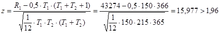 Оба условия не выполняются. Тест Вальда–Вольфовитца позволяет отклонить гипотезу о постоянстве математического ожидания ряда. Тест Манна–Уитни на постоянство математического ожиданияT1 = 150 – количество элементов в первой части ряда; T2 = 215 – количество элементов во второй части ряда; R1 = 43274 – сумма рангов, присвоенных элементам из первой части ряда