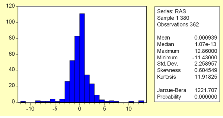 Статистика Дики–Фуллера равна -13,27932. Все приведённые в таблице критические значения больше расчётного, максимальный уровень значимости, при котором можно отклонить гипотезу случайного блуждания – 0, поэтому гипотеза о наличии у процесса характера случайного блуждания отклоняется. Закон распределения полученного рядаКак видно из гистограммы, имеющей более вытянутую по вертикали форму, чем характерная для нормального распределения, и статистических показателей (рис. 5), распределение полученного ряда отлично от нормального: хотя коэффициент асимметрии равен 0,6, что близко к нулю и говорит о симметричности распределения относительно среднего значения, куртозис равен 11,918, что существенно больше трёх. Поскольку закон распределения не является нормальным, для проверки гипотезы о стационарности полученного ряда параметрические тесты неприменимы, и необходимо провести непараметрические тесты.