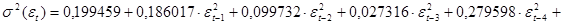 Все коэффициенты в модели дисперсии положительны, значения критериев Акайке и Шварца меньше, чем для модели МА(2). Тем не менее, вероятность статистической незначимости коэффициента при MA(2)ARCH(6):