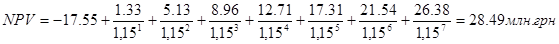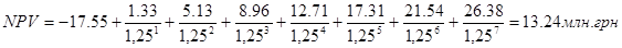 где ЧП – среднегодовая сумма чистой инвестиционной прибыли за период эксплуатации проекта: ЧП = (0,88 + 4,72 + 8,41 + 12,36 + 16,85 + 21,09 + 26,38) / 7 = 12,95 млн.грн.