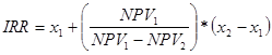 где х1 , х2 – период времени при котором NPVсоответственно приобретает положительное и отрицательное значение; NPV1 , NPV2 – значение NPVв период времени х1 и х2 соответственно.