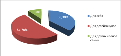 Также интересно было узнать, для кого приобретается молочная продукция. Из всего количества опрошенных 51,7% (31 чел.) респондентов покупают для детей/внуков; 38,3% (23 чел.) - для себя и 10% (6 чел.) - для других членов семьи (рисунок 2.3).