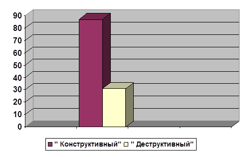 Рис. 6. Выраженность негативного отношения к школе у детей в зависимости от типа родительского отношения к ребенку Детей, родители которых характеризуются «деструктивными» стратегиями, часто наказывают отказом от общения. Дети с заниженной самооценкой вырастают в семьях, где с ними не обучаются, однако спрашивают повиновения; невысоко оценивают, нередко обвиняют, карают, порой - при посторонних; не ждут от них успехов в школе и внушительных достижений в жизни. Отталкиваясь от сказанного, можно сделать вывод, что успеваемость в школе становится одним из главным критерием оценки ребенка как личности со стороны старших и сверстников. Отношение к себе как к ученику в полноценной мере обусловливается семейными ценностями. На первый план у ребенка выходят те его особенности, которые главным образом тревожат его родителей - поддержание авторитета (дома задаются вопросы: «А еще кто заработал пятерку?»), повиновение («А тебя сегодня не ругали?») и т.д. В самосознании школьника смещаются ударения, когда родителей беспокоят не учебные, а повседневные обстоятельства в его школьной жизни («А в классе из окон не дует?», «А что вам подавали на обед?»). Или родителей мало что волнует - школьная жизнь ребенка не обсуждается, а если и обсуждается то только формально. Часто взрослые задают безразличные вопросы: «А что было у вас сегодня в школе интересного?» преждевременно или поздно повергнет к подобающему ответу: «Ничего необычного», «Все стандартно». Также родители задают и исходный уровень притязаний ребенка – именно то, на что он претендует в учебной деятельности и взаимоотношениях. Дети с высокой степенью притязаний, завышенной самооценкой и престижной мотивацией надеются только лишь на успех. И их соображения о существующем так же жизнерадостны. Дети с низкой самооценкой в своей жизни не претендуют на многое. Перед собой они не устанавливают высоких целей и неизменно колеблются в своих потенциалах, стремительно примиряются с тем уровнем успеваемости, который вырабатывается в начале обучения. Анализ и интерпретация полученных эмпирических данных позволяет сделать следующийвывод, подтверждающий гипотезу: если родители характеризуются преобладанием деструктивного типа родительского отношения, то это негативно отразится на качестве успеваемости ребенка в школе. Из этого следует, что конструктивный тип родительского отношения связан с хорошей успеваемостью ребенка в школе при высоких значений ответственности, а деструктивный – с низкой успеваемостью ребенка. Заметим, что респонденты, у родителей которых преобладает конструктивный тип родительского отношения, чувствуют себя комфортно, эмоционально благоприятно в семье. Группа респондентов, родители которых характеризуются преобладанием деструктивного типа родительского отношения к ребенку, чаще испытывают неблагоприятное эмоциональное состояние. Полученные результаты свидетельствуют о том, что доминирование деструктивных стратегий родительского отношения к ребенку негативно сказывается на успеваемости ребенка в школе. Так, повышенная строгость и контроль со стороны родителей препятствуют формированию внутреннего плана оценки собственной деятельности, что ведет к зависимости оценок ребенка от оценок родителей. В этом случае нет условий для формирования у ребен