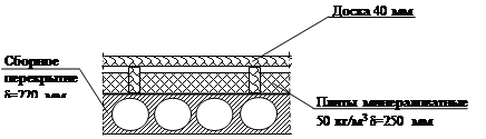 В соответствии с планировочными решениями проектируемого здания средняя величина Rо,wr,ср составляет (с учетом площади участков стен по фасадам здания) 2.1.3.2 Чердачное перекрытие Крыша - чердачная с «холодным» чердаком, сборные железобетонные плиты перекрытия с утеплением минераловатными плитами плотностью gо = 50 кг/м3 толщиной 250 мм и заливкой поверх цементно-песчаным раствором толщиной 40 мм.