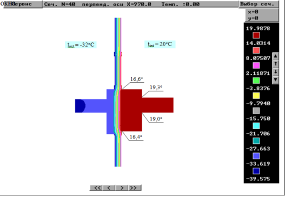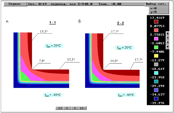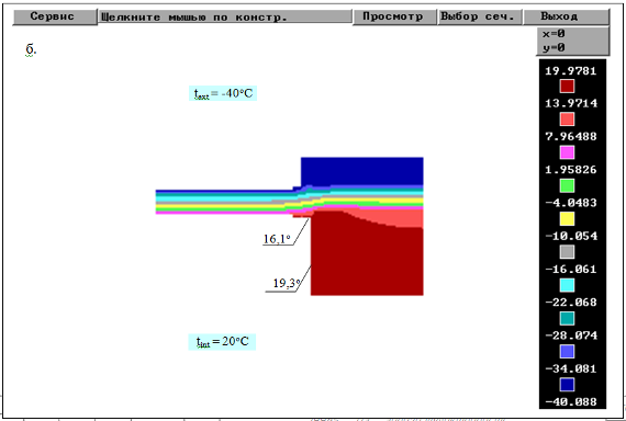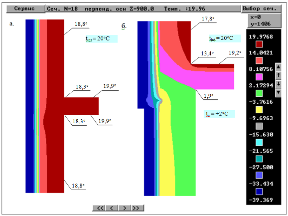 Рис.3.5. Результаты расчета распределения температур узла сопряжения наружной стены с оконным блоком: а – вертикальное сечение; б - горизонтальное сечение по центру окна