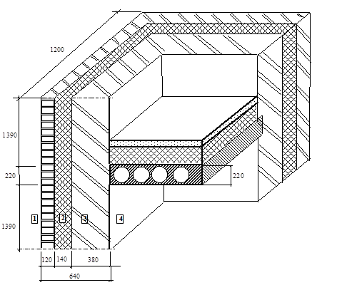 В соответствии с данными табл.2.2 величина расчетного удельного расхода тепловой энергии на отопление и вентиляцию 1 м2 отапливаемой площади для проектируемого здания должна быть не менее 680,0 МДж/(м2×год). 2.1.3 Описание технических решений и результаты оценки приведенного сопротивление теплопередаче отдельных ограждающих конструкций 2.1.3.1 Наружные стены Наружные стены здания – трехслойные с наружным отделочным слоем из силикатного кирпича б=120 мм, теплоизоляционным слоем из пенополистирола плотностью 40 кг/м3 толщиной 140 мм и внутренним отделочным слоем из обыкновенного глиняного кирпича толщиной 380 мм с гибкими стеклопластиковыми связями. Оценка приведенного сопротивления теплопередаче наружных стен выполнена в соответствии с рекомендациями [1, 3] на основании расчета трехмерных температурных полей, выполненных по программе «TEMPER-3D» [7] (сертификат ГОСТ Р № RU.СП11.Н00071). В соответствии с [3] величина Rо,wr рассчитана по формуле ( tint - text ) × A R о ,wr = ¾¾¾¾¾¾ , (2.3) Q где Q - суммарный тепловой поток, входящий в расчетную область внутренней поверхности конструкции, Вт; A - расчетная площадь ограждающей конструкции, м2,. Определение приведенного сопротивление теплопередаче наружных стен выполнено для следующих расчетных участков: - фрагмента глухой стены без проемов, размерами – по высоте – равного высоте этажа h = 3,0 м, по ширине – 1,2 м (рис.2.2); - фрагмента стены с оконными проемами (при толщине утепляющего слоя наружной стены 140 мм), размерами – по высоте - равного высоте этажа h = 3,0 м, по ширине – равного расстоянию между осями оконными проемов; - фрагмента стены с оконными проемами (при толщине утепляющего слоя наружной стены 180 мм) , размерами – по высоте - равного высоте этажа h = 3,0 м, по ширине – равного расстоянию между осями оконными проемов; - фрагмента стены с балконной дверью, размерами – по высоте - равного высоте этажа h = 3,0 м, по ширине – равного расстоянию между осями простенков; - фрагмента стены с окном и балконной дверью, размерами – по высоте - равного высоте этажа h = 3,0 м, по ширине – равного расстоянию между осями простенков; Величина среднего значения приведенного сопротивления теплопередаче наружных стен Rо,wr,ср в соответствии с рекомендациями СП 23-101-2000 [3] определена для всех фасадов здания с учетом суммарной площади глухих участков стен AwI , участков с оконными проемами AwII , AwIII и участков с балконными дверями AwIV, AwV При проведении расчетов в качестве расчетных параметров внутренней и наружной среды принимались: - расчетная температура внутреннего воздуха tint = 20 оС [1]; - расчетная температура наружного воздуха text = - 40 оС [4]; - расчетный коэффициент теплоотдачи внутренней поверхности a int = 8,7 Вт/(м2×оС) [1]; - расчетный коэффициент теплоотдачи наружной поверхности a ext = 23 Вт/(м2×оС) - для наружных стен, окон, чердачного перекрытия [1]. Теплотехнические характеристики материалов в соответствии с [2] принимались для условий эксплуатации "А" (для г.Тара зона влажности – сухая, режим помещений – нормальный). В частности: - цементно-песчаный раствор g о = 1800 кг/м3 , l А = 0,76 Вт/(м×оС); - кирпичная кладка из глиняного обыкновенного кирпича на цементно-песчаном растворе g о = 1800 кг/м3 , l А = 0,70 Вт/(м×оС); - пенополистирол плотностью g о = 40 кг/м3 , l А = 0,041 Вт/(м×оС); - кирпичная кладка из силикатного кирпича на цементно-песчаном растворе g о = 1800 кг/м3 , l А = 0,76 Вт/(м×оС). Оценка пр
