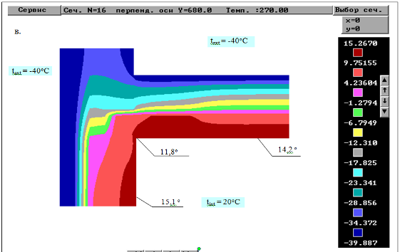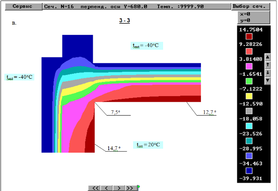 Рис.3.4. Результаты расчета распределения температур узла сопряжения наружного выступающего угла с плитами чердачного перекрытия при устройстве термовкладыша по торцу плиты и над плитой в толще стены: а – горизонтальное сечение на расстоянии 20 мм от плиты перекрытия; б - горизонтальное сечение на расстоянии 600 мм от плиты перекрытия; в – вертикальное сечение на расстоянии 10 мм от угла