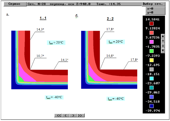Рис.3.1. Результаты расчета распределения температур: а- узла сопряжения глухого участка наружной стены с плитами перекрытия, б- узла сопряжения цокольного участка наружной стены с плитами перекрытия - устройство в наружном выступающем углу термовкладыша по торцу плиты перекрытия толщиной 60-80 мм длиной 400 мм (от поверхности угла в каждую сторону); - устройство термовкладыша над плитой перекрытия в толще внутреннего слоя кирпичной кладки толщиной 40 мм сечением 250х700 мм от поверхности угла в каждую сторону (см. рис.3.4); Это решение необходимо для всех наружных выступающих углов верхнего этажа. Для повышения температуры поверхности в зоне сопряжения плиты перекрытия с наружной стеной (по длине плиты чердачного перекрытия) рекомендуется увеличение толщины утеплителя до 150 мм - вдоль наружных стен на расстояние 400-500 мм. 3. Оконные блоки должны быть установлены в слое утеплителя непосредственно у четверти стены. В этом случае требуемая температура внутренней поверхности оконных откосов обеспечивается без устройства каких-либо термовкладышей. Рекомендуемые схемы установки оконных блоков приведены в приложении 3.