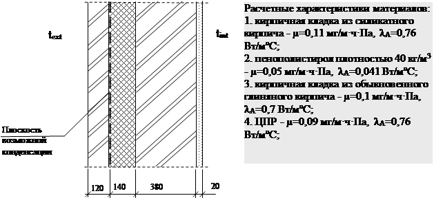 Рис.4.1 Расположение плоскости возможной конденсации 4.2 Результаты расчета влажностного режима наружной стены При расчетной температуре внутреннего воздуха tвр = +20 оС и относительной влажности внутреннего воздуха j вр = 55% [2] величина максимальной упругости водяного пара внутреннего воздуха составит Ев =2338 Па [3], а величина расчетной упругости водяного пара внутреннего воздуха ев = 0,55 × 2338 =1286 Па. Общее сопротивление теплопередаче наружной стены (по глади) равно: 1 0,02 0,38 0,14 0,12 1 Ro,wr = ¾¾ + ¾¾ + ¾¾ + ¾¾ + ¾¾ _+ ¾¾ _= 4,3 м2×оС/Вт. 8,7 0,76 0,7 0,041 0,76 23 Продолжительность сезонов (зима, весна-осень, лето) и среднесезонные температуры для р.п Муромцево приняты как для г. Тары, ближайшего населенного пункта, который указан в СНиП 23-01-99 - зимний - tср = -15,26 оС (янв. tср = -19,9 оС, февр. tср = -18,0 оС; март tср = -11,4 оС; нояб. tср = -9,8 оС; дек. tср = -17,2 оС); - весенне-осенний - tср = +0,35 оС (апр. tср =─0,1 оС, окт. tср =+0,8 оС); - летний - tср = +13,26 оС (май tср =+9,1 оС, июнь tср =+15,5 оС; июль tср = +17,7 оС; авг. tср =+14,8 оС; сент. tср =+9,2 оС). Определим значение температур в плоскости возможной конденсации для каждого периода: t