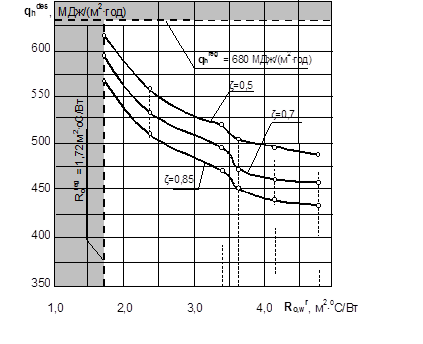 Рис.4.1.3. Зависимость удельного годового расхода тепла на отопление и вентиляцию здания от сопротивления теплопередаче наружных стен при различной эффективности системы отопления ЗАКЛЮЧЕНИЕ Анализ проектных решений 20-ти квартирного жилого дома с использованием конструкций недостроенного детского сада на 140 мест в р.п. Муромцево (разработчик проекта – ООО «СИБСТРОЙПРОЕКТ», шифр проекта – ССП-1), результаты теплотехнических и теплоэнергетических расчетов, сопоставление полученных значений с требованиями ТСН 23-338-2002 Омской области позволили сделать следующие выводы: 1. Теплозащитные качества ограждающих конструкций проектируемого здания соответствуют требованиям СНиП II-3-79* «Строительная теплотехника» по санитарно-гигиеническим и комфортным условиям: - расчетное значение среднего приведенного сопротивления теплопередаче наружных стен составляет Rо,wr,ср = 3,99 м2×оС/Вт, что существенно выше минимально допустимого по санитарно-гигиеническим условиям Rоmin = 1,72 м2 ×оС/Вт; - расчетное значение сопротивления теплопередаче цокольного перекрытия над «теплым» подвалом составляет Rоfr = 1,79 м2×°С/Вт при регламентируемом значении Rоfreq = 1,03 м2×°С/Вт; - расчетное значение сопротивления теплопередаче чердачного перекрытия «холодного» чердака составляет Ro,cr = 5,46 м2 ×оС/Вт, при регламентируемом значении Ro,crеg = 2,07 м2 ×оС/Вт; - приведенное сопротивление теплопередаче оконных блоков - RоFr = 0,61 м2×°С/Вт при регламентируемом значении RоFreg = 0,61 м2×°С/Вт. 2. Минимальная температура внутренней поверхности ограждающих конструкций в местах теплопроводных включений существенно выше температуры «точки росы», за исключением узлов сопряжений наружного выступающего угла с плитой чердачного перекрытия. В этих узлах необходимо: - устройство в наружном выступающем углу термовкладыша по торцу плиты перекрытия толщиной 60-80 мм длиной 400 мм (от поверхности угла в каждую сторону); - устройство термовкладыша над плитой перекрытия в толще внутреннего слоя кирпичной кладки толщиной 40 мм сечением 250х700 мм от поверхности угла в каждую сторону (см. рис.3.4); Это решение необходимо для всех наружных выступающих углов верхнего этажа. Для повышения температуры поверхности в зоне сопряжения плиты перекрытия с наружной стеной (по длине плиты чердачного перекрытия) рекомендуется увеличение толщины утеплителя до 150 мм - вдоль наружных стен на расстояние 400-500 мм. 3. Для обеспечения регулируемого притока воздуха в жилые помещения рекомендуется устройство приточных вентиляционных клапанов марки «В-75», встраиваемых в наружную стену за отопительным прибором. Характеристика и схема установки приточных устройств «В-75» приведена в приложении 4. 4. Расчетные показатели удельного расхода тепловой энергии на отопление и вентиляцию 1 м2 отапливаемой площади проектируемого здания соответствуют нормативным требованиям ТСН 23-338-2002 Омской области. Расчетный удельный расход тепловой энергии на отопление и вентиляцию проектируемого здания при коэффициенте эффективности авторегулирования системы отопления V=0,85 составляет qhdes = 449,1 МДж/(м2×год); нормативное значение удельного расхода тепловой энергии составляет qhreg = 680,0 МДж/(м2×год). В соответствии с табл.4.4 ТСН 23-338-2002 Омской области запроектированному 20-ти квартирному жилому дому с использованием конструкций недостроенного детского сада на 1