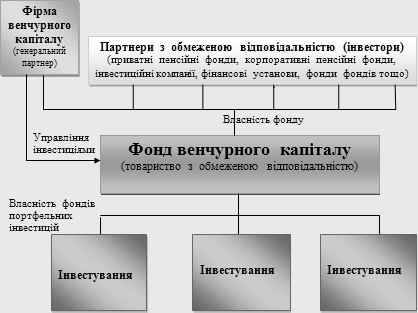 Рис.1.1. Схема структури загального фонду венчурного капіталу Запропонована схема діє переважно в США та деяких країнах Європи, зокрема Їзраїлі. Для забезпечення високої прибутковості венчурні фонди повинні вибрати найменш конкурентні види бізнесу - ними стають підприємства з виробництвом наукомісткої продукції. Головна перевага таких підприємств - інтелектуальна складова. Знання приносять значно більший економічний ефект, ніж матеріальні ресурси, адже видобуток і транспортування останніх вимагає значних витрат. Ось чому інвестиції в хай-тек зручні і досить швидко приносять прибуток. Така інвестиційна діяльність триває від двох років до п'яти, і часом може принести в результаті до 300% річних прибутку. Але не можна забувати про значення самого слова "венчур". За статистикою, лише 40-45% ризикових вкладень закінчуються вдало. Інші - або не приносять ніякого доходу, або наносять збиток інвесторам. Однак пільгове оподаткування і повна свобода вкладень робить цей бізнес дуже привабливим. Не варто забувати, що в Європі та США венчурні фонди приносять інвесторами мільярдні доходи. Щоправда, на Заході вкладати кошти у венчурні фонди дозволено не тільки фізособам, але і пенсійним фондам. У нас венчурні фонди більш ризиковані, однак можливостей для великого заробітку набагато більше. Значення венчурного бізнесу полягає в тому, що він: 1) привів до створення нових життєздатних господарських одиниць, які впливають на всю традиційну структуру ведення наукових досліджень, і викликав структурні зміни в суспільному виробництві країн; 2)сприяв технічному переозброєнню традиційних галузей виробництва; 3) спонукав великі корпорації до вдосконалення принципів управління та організаційних структур; 4) змінив погляд на ніби постійну перевагу великих корпорацій в дослідницькій діяльності; 5) показав, що орієнтація на довгострокові цілі вимагає створення спеціальної кредитно-фінансової системи у вигляді венчурного капіталу; 6) збільшив зайнятість висококваліфікованих фахівців; 7) сприятливо вплинув на розвиток законодавчої бази з проблем підтримки наукових досліджень. Венчурний бізнес здійснюється завдяки діяльності венчурних підприємств, про що і йтиметься далі. Венчурний бізнес не дає стовідсоткової гарантії прибутку в бізнесі. Венчурні інвестиції можуть принести як колосальний дохід, так і колосальний збиток. Втім, на користь венчурного бізнесу свідчить той факт, що він значною мірою вплинув на зростання економіки Європи і Америки, і не був так схильний економічній кризі, як традиційні види бізнесу. В даний час і на Україні відбувається формування сприятливих умов для розвитку венчурного підприємництва і венчурного бізнесу [86, с.6-8]. Венчурні інвестиції небезпечніше вкладати у вже функціонуюче та зростаюче підприємство, так як вони пов'язані з наступними основними ризиками: - існує високий ступінь технічної невизначеності у створенні продукту; - технологічно досконалий продукт може не відповідати ринковому попиту; - не враховані будь-які ринкові фактори при формулюванні бізнес ідеї; - відсутній чіткий план і програма дій щодо реалізації венчурного проекту. Такі ризики виправдовуються тим, що реалізація інноваційного проекту, що є об'єктом венчурних інвестицій, спочатку оцінюється як високоприбуткове. Сутність венчурного бізнес